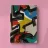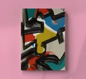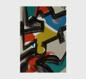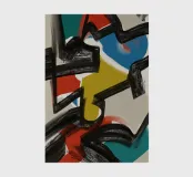 Kräftige schwarze Pinselstriche überlagern rote, blaue, gelbe und blaugrüne Blöcke und schaffen eine abstrakte und dynamische Komposition. Die Pinselstriche variieren in Dicke und Richtung und verleihen dem Werk ein Gefühl von Bewegung und Tiefe.