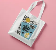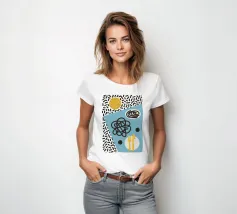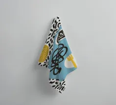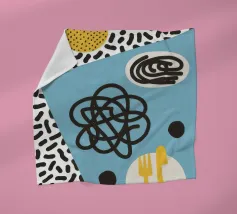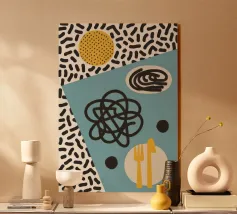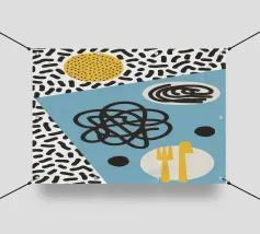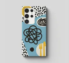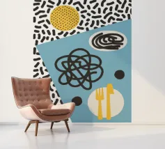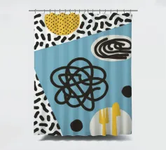 Eine abstrakte Komposition im Memphis-Stil mit verspielten Schnörkeln, geometrischen Formen und Mustern in einer kühlen Farbpalette aus Blau, Schwarz und Weiß mit einem Hauch von Gelb.