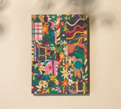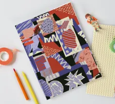 Ein abstraktes Muster kombiniert patchworkartige Farbblöcke mit energiegeladenen Kritzeleien und Streifen und schafft so ein dynamisches, verspieltes und künstlerisches Design.