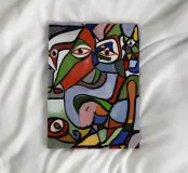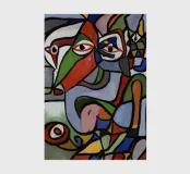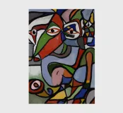 Eine lebhafte abstrakte Komposition präsentiert ineinander greifende Formen und Farben, die an einen kubistischen Stil erinnern. Kräftige Linien definieren die verschiedenen geometrischen Formen, die mit einer auffälligen Verwendung von kontrastierenden Farben und Tönen zusammenspielen.