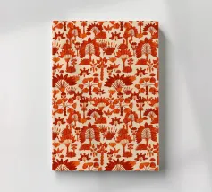 Stilvoller Blumendruck im Boho-Chic mit leuchtend roten, orangefarbenen und rosafarbenen Rosenblüten mit grünen Stängeln und Blättern auf orangefarbenem Hintergrund.