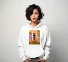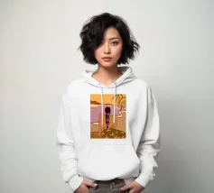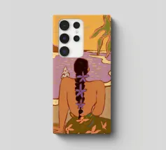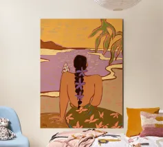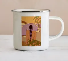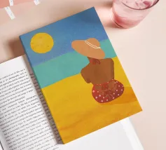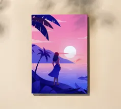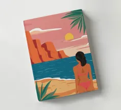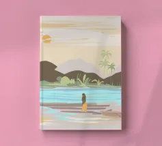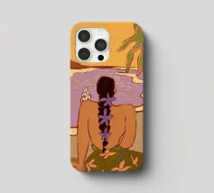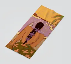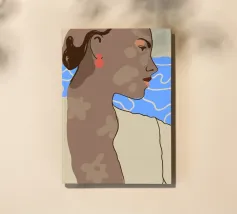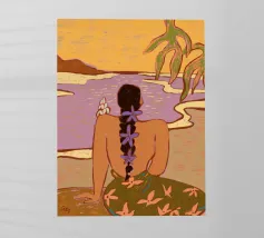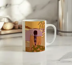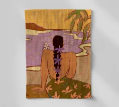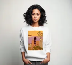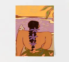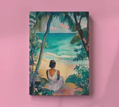 Eine Frau blickt auf den Horizont, eine Muschel auf der Schulter, und lauscht dem Flüstern des Windes und dem Rhythmus der Wellen. Das Meer ruft leise und lädt sie ein, in diesem ruhigen Moment der Stille zu verweilen, in dem sich Seele und Meer in sanfter Harmonie begegnen.
