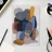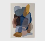 Ein abstraktes Gemälde mit einem vertikalen Stapel sich überlappender, abgerundeter Formen in einer Palette von Erdtönen wie Braun, Ocker, Blau, Grau und Beige, die an ein natürliches Totem erinnern.