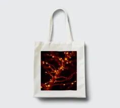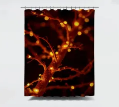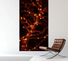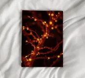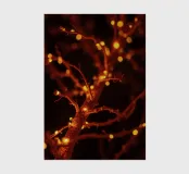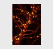 Eine Nahaufnahme eines mit warmen, funkelnden Lichtern geschmückten Baumzweigs. Der goldene Schein sorgt für eine beruhigende Atmosphäre. Dieses Design fängt einen heiteren Moment ein.