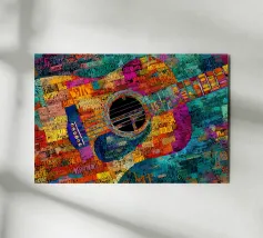 Ein modernes abstraktes Gemälde mit geometrischen Formen, die Gitarren, Geigen und Musiknoten in einer kühnen, farbenfrohen Komposition darstellen. Der strukturierte Hintergrund und die dynamische Anordnung wecken ein Gefühl von Rhythmus und künstlerischem Ausdruck.