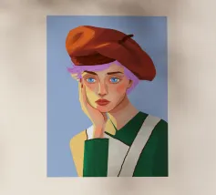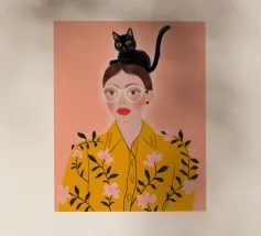 Dieses Kunstwerk zeigt eine Person mit kurzen blonden Haaren, die eine geblümte Jacke trägt und ein Buch hält. Der leuchtend gelbe Hintergrund unterstreicht die schicke und stilvolle Essenz.