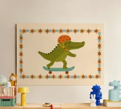 Verleihen Sie jedem Kinderzimmer einen Hauch von Freude mit diesem entzückenden Wandbild mit Krokodil-Motiv. Die Illustration zeigt ein fröhliches grünes Krokodil mit roten Wangen und geschlossenen Augen vor einem zartrosa Hintergrund und strahlt Ruhe und Charme aus. Perfekt für Kinderzimmer, Kleinkindzimmer oder als verspielter Akzent in jedem Raum, in dem viel gelacht wird.
