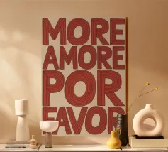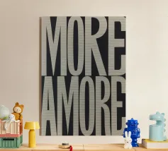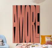 Typografie-Design mit dem Schriftzug „AMORE“ in fettgedruckten, leicht abgerundeten, blockigen Buchstaben auf schwarzem Hintergrund. Die hellrot-braune Farbe der Buchstaben erzeugt einen modernen, auffälligen Kontrast und eine klare visuelle Wirkung.