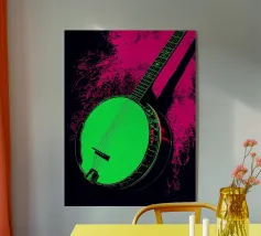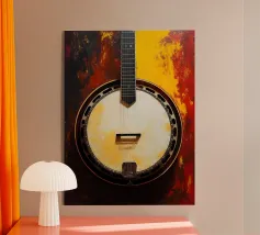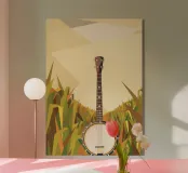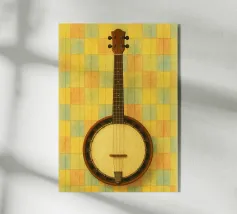 Holen Sie sich eine Illustration eines Banjos im Gras mit einem warmen geometrischen Stil.