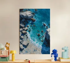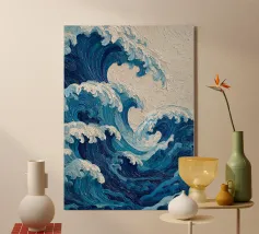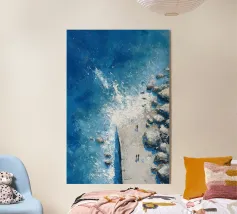 Dieses Kunstwerk fängt eine kraftvolle Luftperspektive von Wellen ein, die sich an einer ruhigen Küstenlinie brechen, gemalt mit dichten, ausdrucksstarken Texturen. Tiefe Blautöne lösen sich in hellere Türkistöne auf, während die schäumende weiße Brandung eine dynamische Grenze zwischen Bewegung und Stille bildet. Kleine menschliche Figuren am Ufer betonen den Maßstab und die Kontemplation und erden die gewaltige Energie des Meeres. Die Komposition, in der sich Abstraktion und Realismus die Waage halten, erforscht Kontraste, Rhythmus und die emotionale Anziehungskraft des Ozeans und ist damit ein eindrucksvolles Werk für moderne Innenräume und großformatige Kunstdrucke.