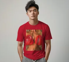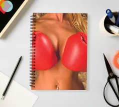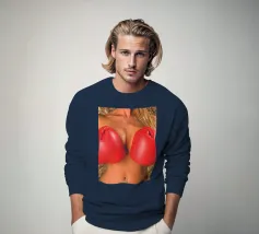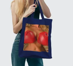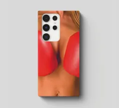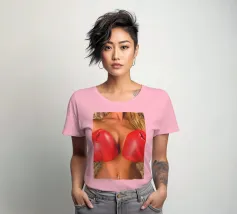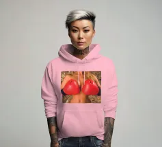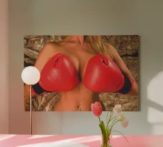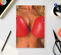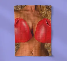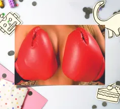 Eine junge Frau, die ihre Brüste mit roten Boxhandschuhen bedeckt