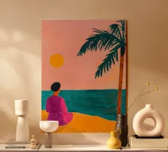 Anmutiges digitales Gemälde einer selbstbewussten Frau in einem fließenden weißen Gewand, die an einem felsigen Strand mit Palmen und einer leuchtend orangen Sonne sitzt. Diese stilvolle, ruhige Küstenszene erinnert an Luxus, Ruhe und tropische Stimmung. Perfekt für Modeliebhaber, Liebhaber moderner Kunst und tropische Wohnkultur. Bringt Raffinesse und Wärme in Wohnzimmer, Schlafzimmer oder Büro. Ein ideales Geschenk für Kunstsammler und Liebhaber zeitgenössischer Porträts mit einem vom Strand inspirierten Thema.