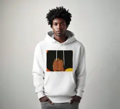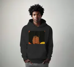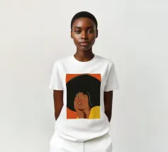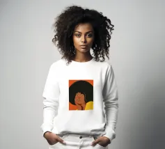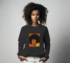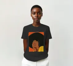 Porträt einer Frau mit einem Afro mit gelben und orangefarbenen Schmetterlingsaugen.