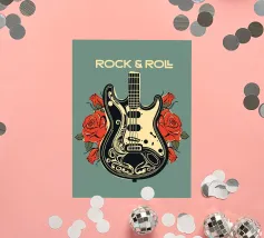 This vibrant poster combines the spirit of rock and roll with artistic flair, featuring a detailed electric guitar surrounded by bold red roses. A perfect homage to music and style, it adds energy and charm to any space.
