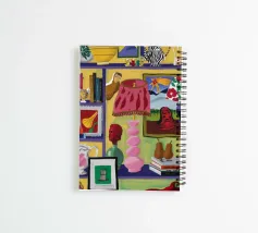 Ein maximalistisches Interieur zeigt eine reizvolle Fülle von gerahmten Bildern, verschiedenen Objekten, farbenfrohen Möbeln und lebhaften Mustern, die eine Atmosphäre von künstlerischer und fröhlicher Sammlung schaffen.