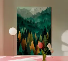 A whimsical and colorful illustration of a magical forest, featuring towering trees with vibrant patterns and a starry night sky. The piece evokes a sense of wonder and adventure, perfect for adding a touch of fantasy to any space.