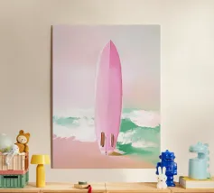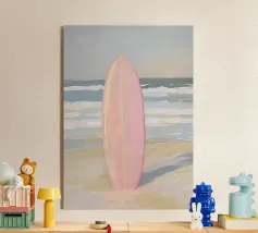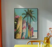 Vibrant tropical beach art with colorful vintage surfboards, palm trees, and pastel skies. A nostalgic tribute to surf culture and summer freedom.