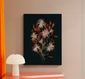 Ein bezauberndes Arrangement aus zarten, federleichten Blüten in Weiß- und Rosatönen, die sich von einem tiefschwarzen, samtigen Hintergrund abheben. Die filigranen Details und Texturen der Blüten schaffen ein Gefühl von ätherischer Schönheit.