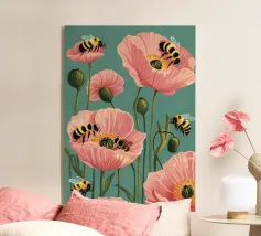 Das detailreiche Design zeigt eine Vielzahl von leuchtenden Blumen, die von fleißigen Bienen besucht werden.