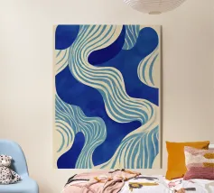 Ein gewagtes abstraktes Muster mit einem Hauch von dynamischer Energie, das Bewegung und Fließen symbolisiert. Kräftige Farben, die Themen wie Wasser, Leben und Bewegung hervorrufen. Eine innovative Verschmelzung von Tradition und Moderne für zeitgemäße, minimalistische Innenräume. eine einzigartige visuelle Sprache, die kulturelle Grenzen überwindet.
