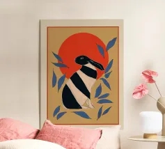 Bringen Sie wilde Eleganz in Ihren Raum mit diesem Kunstdruck im Linolschnitt-Stil. Der schwarze Fuchs mit seinem filigranen weißen Fell, umrahmt von roten botanischen Blättern und einer kräftigen Sonne, verbindet den Charme der Volkskunst mit modernem Minimalismus. Perfekt für Fans von Naturdrucken, skandinavischem Dekor und Tierkunst im Holzschnitt-Stil.