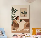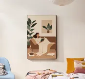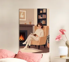 Ein minimalistisches digitales Gemälde einer Frau, die sich mit einem Buch in der Hand auf einem Sofa zurücklehnt. Umgeben von üppigen Zimmerpflanzen und einer dampfenden Tasse Kaffee, fängt die Szene die Essenz von Selbstfürsorge und langsamen Abenden zu Hause ein. Perfekt für moderne und gemütliche Innenräume gleichermaßen.