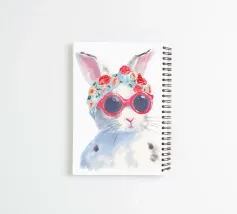 Das Motiv zeigt ein Niedlicher Hase mit roter Sonnenbrille, blauer Kopfbedeckung und einem Kranz aus rosa Blumen. Die zarten Pinselstriche und sanften Pastelltöne verleihen der Illustration einen humorvollen und zugleich eleganten Charakter. Ein verspieltes Kunstwerk, das Lebensfreude und Stil mit einem Augenzwinkern verbindet.