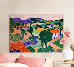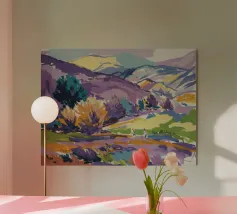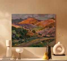Lockere, kühne Pinselstriche in Ocker und Violett bilden eine rhythmische, modernistische Interpretation von kultivierten Hügeln und entfernten Bergkämmen. Die schwungvolle Wiederholung von Reihen und Bäumen schafft ein Gefühl von Ordnung und Offenheit - eine abstrakte Hommage an Agrarlandschaften in der Abenddämmerung.