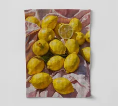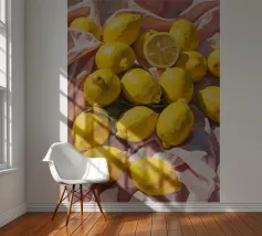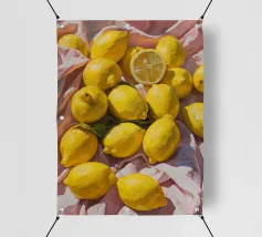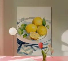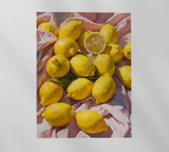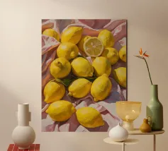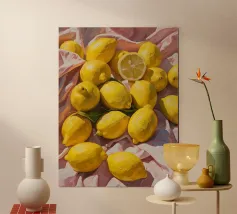 Ein lebhaftes Ölgemälde, das eine Gruppe frischer Zitronen in satten, sonnenbeschienenen Farbtönen zeigt. Die strukturierte Pinselführung und die naturgetreuen Details vermitteln Frische und Wärme und machen es zu einer perfekten visuellen Feier der Schönheit von Zitrusfrüchten und natürlicher Eleganz. Ideal für die Küche oder jeden anderen Wohn- oder Arbeitsbereich.