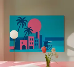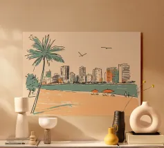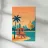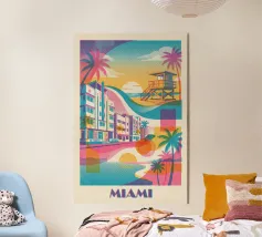 Minimalistisches Miami Design mit bekanntem Rettungsschwimmerturm, Palme, Meer und verschiedenen typischen Gebäuden. Dekoratives Geschenk für alle die diese Metropole im US-Bundesstaat Florida lieben. Sonnenuntergansstimmung an ruhigem Meer in Miami.
