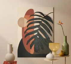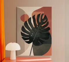 monstera blatt Geometrische Formen rosa Kreis ockerfarbener Kreis botanisch Natur organische Formen Pflanze Laub minimales Design Vasenform tropisches Thema natürliche Elemente Blatt Zimmerpflanze ausgeschnittene Formen negativer Raum modernes Design tropisches Blatt dekorative Elemente