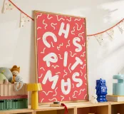 Genießen Sie eine festliche Illustration mit dem Wort "Weihnachten" auf einem roten Hintergrund.