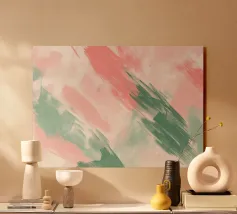 Dieses ausdrucksstarke abstrakte Kunstwerk fängt Bewegung und Emotionen durch übereinanderliegende Pinselstriche und kräftige Farbkontraste ein. Tiefes Waldgrün überschneidet sich mit zartem Mint, Korallenrosa und warmen Neutraltönen und schafft eine dynamische und doch harmonische Komposition. Die sichtbare Textur und die ausladenden Gesten verleihen dem Werk ein Gefühl von Rhythmus und Spontaneität, während die ausgewogene Farbpalette für optische Ruhe sorgt. Dieses Werk ist ideal für zeitgenössische Innenräume, moderne Wandkunst oder großformatige Kunstdrucke und zelebriert Bewegung, Textur und malerische Freiheit.