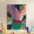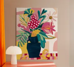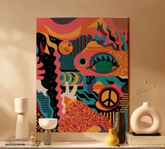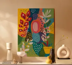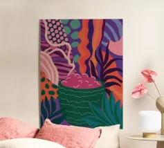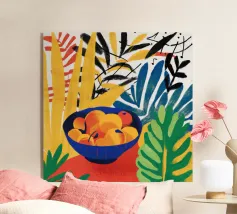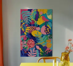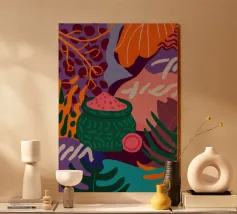 Eine abstrakte Komposition zeigt eine Schale mit Erdbeeren inmitten eines Wirbels aus bunten, organischen Formen und Mustern, die eine frische und moderne Interpretation eines Sommerklassikers darstellen.