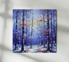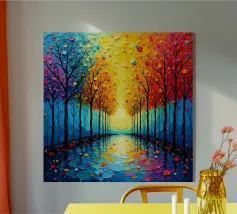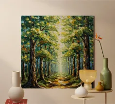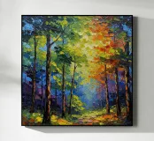 This vibrant oil painting captures the breathtaking beauty of a forest illuminated by sunlight. The artist uses a unique impasto technique, applying thick layers of paint to create a rich, textured surface that you can almost feel. The bold, expressive strokes bring the scene to life, from the deep purples and blues of the cool shadows on the left to the fiery oranges and yellows of the sun-drenched canopy on the right. A winding path invites you deeper into the woods, evoking a sense of peaceful exploration and the magic of nature. This piece is a stunning celebration of light, color, and the