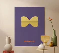 Dieses Kunstwerk verleiht jedem Raum einen verspielten und doch klassischen Touch. Perfekt für Küchen, Trattorias oder Pasta-Liebhaber, ist es eine stilvolle Art, Vintage-Charme und italienisches Flair in Ihre Einrichtung zu bringen! Zelebrieren Sie die zeitlose Anziehungskraft von Pasta mit diesem Poster im Retro-Stil! Mit einem kühnen, minimalistischen Design einer einzelnen Farfalle-Nudel