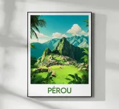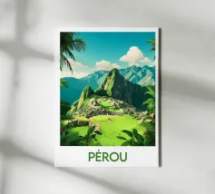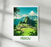 Poster aus Peru, eine spektakuläre Illustration von Machu Picchu, eingebettet zwischen grünen Bergen und strahlendem Himmel. Perfekt für eine historische und natürliche Wanddekoration.