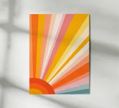 Radiating lines in soft earth tones burst from a semicircle centrally positioned at the bottom, creating a sunburst effect. The design uses warm hues of peach, cream, and brown, adding a retro aesthetic.
