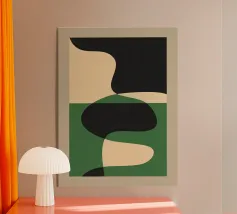 Gewellte Linien, blockige Formen und genug staubiges Rosa, um Ihren Therapeuten stolz zu machen. Poster 00904 ist purer Algorithmus-Minimalismus aus der Mitte des Jahrhunderts. Ein weiteres stolzes Stück der "Unoriginal Art Collection" - smart, stilvoll und immer ein wenig passiv-aggressiv.