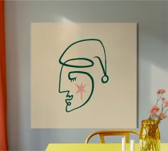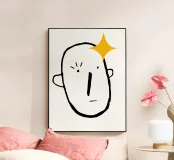 Ein einfaches, abstraktes Gesicht ist mit kräftigen schwarzen Linien gezeichnet und weist eine markante gelbe Sternform auf der Stirn auf. Der Ausdruck ist minimal, mit kleinen Punkten als Augen und einer geraden Linie als Mund.
