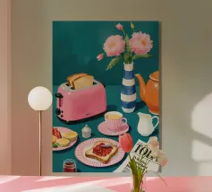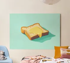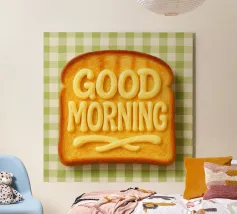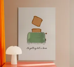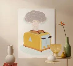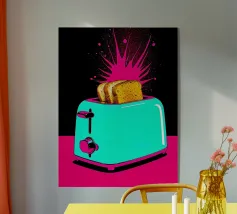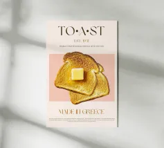 Getoastete Brotscheiben mit lächelnden Gesichtern schweben über einem gelben Toaster. Im Hintergrund steht ein Text über Verpackung, Produktion und Mischen, der Nachhaltigkeit und Energieeinsparungen betont.