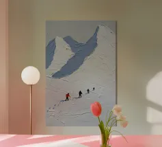 Dieses Kunstwerk zeigt eine Luftaufnahme von Skifahrern, die sich durch geschwungene, skulpturale Schneeformen bewegen, die an fließende Ströme erinnern. Dicke, geschichtete Pinselstriche schaffen eine fühlbare Oberfläche und lassen die Grenze zwischen Landschaft und Abstraktion verschwimmen. Die gewundenen Spuren leiten den Blick über die Komposition, während die kleinen Figuren den Maßstab und das Gefühl einer ruhigen Bewegung vermitteln. Das Zusammenspiel von Licht, Schatten und Textur verwandelt den Winterhang in eine visuelle Meditation über Bewegung, Rhythmus und die vergänglichen Spuren, die die menschliche Präsenz hinterlässt - ideal für zeitgenössische Räume und großformatige Kunstdrucke.