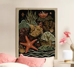 Eine sanfte Komposition mit Seesternen, Muscheln und fließenden Formen in warmen Erd- und Sandtönen. Das Werk vermittelt durch Farbe und Ausgewogenheit ein ruhiges Gefühl des Meeres.
