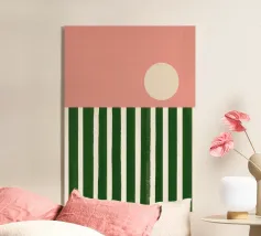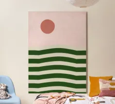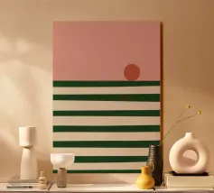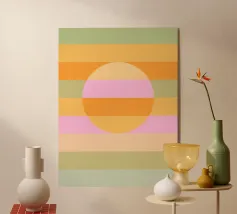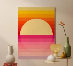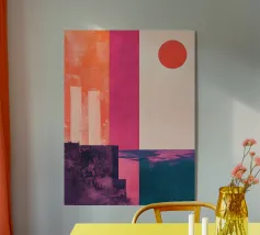 Ein leuchtender oranger Kreis schwebt über sieben vertikalen pinken Balken – wie eine abstrahierte Sonne über einer geometrischen Landschaft. Dieses minimalistische Kunstwerk strahlt durch seine Klarheit, Symmetrie und Farbkontraste eine fast meditative Spannung aus. Ideal für moderne Räume mit Fokus auf Farbe, Form und Stille.