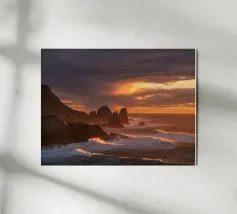 The water reflects the colors like a mirror, its surface glowing with soft, rippling light. Gentle waves roll toward the shore, catching the last rays of the day. The air feels still and peaceful, filled with the calming rhythm of the sea. It’s a quiet, breathtaking moment where sky and ocean blend into one warm, glowing scene."