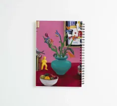 Eine bezaubernde Szene entfaltet sich mit einer blaugrünen Vase, die einen bunten Blumenstrauß hält, neben ordentlich gestapelten Büchern und kleinen Figuren auf einem rosa Tisch vor einer rosa Wand mit Fenster.