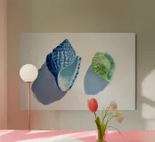 A clean watercolor composition featuring two seashells rendered in cool ocean blues and soft sea-green tones. The open shell and spiral form create a gentle dialogue between shape and space, while subtle shadows ground the elements against the white background. Transparent washes and delicate texture give the piece a light, airy feel. Minimal and serene, this artwork is well suited for coastal, modern, or spa-inspired interiors, bringing a sense of calm, balance, and seaside simplicity to any room.