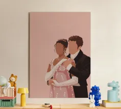 Sinnliches Paar, das sich in goldenem Licht umarmt Dieses Bild zeigt ein Paar bei einem zärtlichen, intimen Tanz, umgeben von warmem, goldenem Licht und gedämpften Farben. Es erinnert an die stimmungsvolle Atmosphäre des klassischen Film Noir und an die nuancierten, psychologischen Porträts von Lucian Freud.