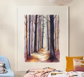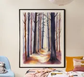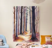 Treten Sie ein in die heitere Schönheit des "Enchanted Forest Pathway", einer fesselnden Aquarelllandschaft, die Sie auf eine ruhige Reise einlädt. Dieses stimmungsvolle Kunstwerk zeigt eine Ansammlung von hoch aufragenden Bäumen, deren schlanke Stämme in einer harmonischen Palette aus warmen Brauntönen, tiefem Violett und zarten Grautönen gemalt sind und sich in den Himmel recken. Ein gewundener Pfad, der in ätherisches, schimmerndes Licht getaucht ist, führt den Betrachter tiefer in den mystischen Wald hinein und schafft ein Gefühl der Verwunderung und friedlichen Introspektion. Das sanfte Leuchten suggeriert eine verborgene Lichtung oder einen Neuanfang und macht dieses Stück zu einem idealen Begleiter für eine ruhige und inspirierende Atmosphäre.