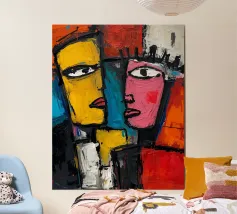 Lassen Sie sich von dieser modernen kubistischen Illustration fesseln, die geometrische Formen und vibrierende Farben verschmilzt, um zwei abstrakte Gesichter darzustellen. Jedes Detail, von den Augen bis zu den Lippen, ist in Farbsegmente wie Blau, Rot, Gelb und Orange dekonstruiert, wodurch eine dynamische und auffallende Optik entsteht. Mit seinen klaren Linien und starken Kontrasten verleiht dieses Bild Ihrer Wanddekoration einen kühnen und zeitgemäßen Touch.